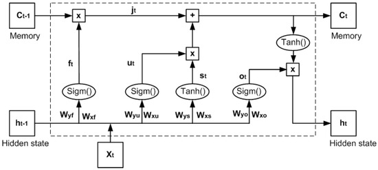 Long short term memory (LSTM), a complicated type of deep learning architecture published in 1997 by Hochreiter and Schmidhuber [51], includes memory for representing temporal dependencies in time sequential problems. LSTM extends a deep recurrent neural network (RNN) with memory blocks containing memory cells, instead of recurrent units, to ease the learning of temporal relationships when there are long time delays between events. The memory cell has three different gates: an input gate, a forget gate, and an output gate. These gates decide which operation is to be performed, such as write (input gate), reset (forget gate), or read (output gate). In particular, the forget gate adjusts the internal value of the cell before adding it as an input to the cell using self-recurrent connection, therefore suitably resetting or forgetting the cell’s memory [52]. Additionally, a modern LSTM architecture includes peephole connections from its inner cells to the gates in order to learn exact timing of the outputs [53]. The activation functions of the LSTM units are operated in the same way as those in RNNs [51], and the hidden value of an LSTM cell is updated at each time step. LSTM has recently achieved great success in time series analysis, for example in speech recognition [54] and language translation tasks [55].