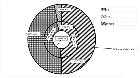 One of the basic techniques for searching in complex database is using the Boolean operators. Boolean searching is a symbolic logic system that creates relationships between concepts and words. Systematic reviews through Boolean searching allow one to analyze all studies in a specific research field, so it is particularly suitable to search papers for a scientific review on a specific topic. The research was performed using the databases Science Direct, ISI Web of Knowledge, and Google Scholar. The first step consisted in using the search string “Precision Forest Harvesting” like “Precision Forest Utilization”, “Technology Assisted Forest Utilization”, and “Technology Assisted Forest Harvesting”. After that, three specific categories (GIS, GNSS, and electronic sensors) were developed; these categories were selected on the basis of their highest weight in comparison to other ones. Total findings of this research, without any temporal restriction, were over 57,990, while referring the research to the last five years, over 34,140 findings appeared (Figure 1). It is important to underline that about 60% of findings were published in the last 5 years, thus demonstrating the great activity of scientific research on these topics.