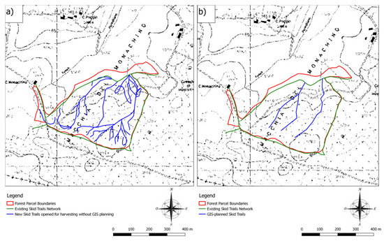 An example of the efficiency of GIS in forest operations planning is given in Figure 2, which is a real application by the authors of precision forest harvesting in a Central Italy turkey oak coppice forest yard, utilizing the methodology proposed by Picchio et al. [11]. In the above-mentioned figure, it is possible to see the great difference in terms of skid trails number and length between a GIS-planned (Figure 2b) and a not-planned (Figure 2a) yard.