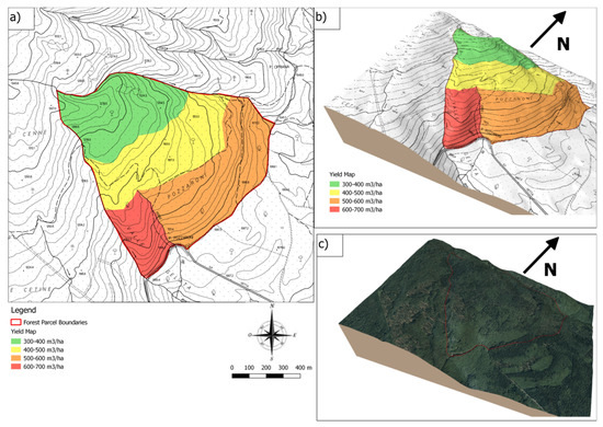(a) Forest yield map developed from GIS elaboration of data from forwarder on-board computer (OBC) system (John Deere TimberLink). (b) The same forest yield map reported on a 3D model of the surface with the identification of contour lines. (c) 3D model of the surface with Orthophoto of the area.