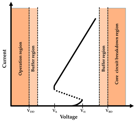 In recent years, the UHV LDMOS has been implemented in power electronics, Microelectromechanical systems (MEMS) domains, power management circuits, and internet of things (IoT) applications [1,2,3,4,5,6,7,8,9,10,11,12,13,14,15,16]. The power management circuit is also an indispensable project of the internet of things. The internet of things is facing the tricky problem of battery endurance, but it can be improved through the power management circuit [14]. However, high-voltage ICs pose serious risks to electrostatic discharge (ESD), and according to the statistics, the ratio of component failure is nearly half due to ESD damage, so ESD protection for the silicon chips is needed to reduce the number of ESD failures. To achieve effective ESD protection, according to the ESD design window shown in Figure 1, there are three important parameters: trigger voltage (Vt1), holding voltage (Vh), and secondary breakdown current (It2). The trigger voltage must be lower than the core circuit breakdown voltage. However, if a high-voltage transient is injected into a circuit, the protection device should be turned on to bypass the heavy current in order to avoid core circuit destruction. Additionally, these protection devices need to be turned on quickly and can sustain a heavy current. The Float Cum Boost Charger (FCBC) architecture [17] itself is susceptible to large current damage, so a contactor is commonly used to discharge its large voltage/current. The ESD protection component in our paper is also the same as the contactor role, so the UHV nLDMOS component response time (Vt1 related) is a key factor. Therefore, we can find out the Vt1 of the component by using the transmission-line pulse (TLP) system to determine whether the protection component can be turned on quickly under a large voltage/current bombardment to prevent the circuit from being damaged by the instantaneous large voltage and current transient. The holding voltage must be higher than positive supply voltage (VDD), otherwise there is a latch-up risk. The secondary breakdown current is as high as possible because it is defined as a device of ESD ability. Additionally, the whole-chip ESD protection design has been proposed to suggest where the chip should be protected to reduce the ESD risk [18]. The protect method is divided into two types—the first is to design ESD protection circuits, which protect chips by using the gate-couple technique [19,20] and the substrate-trigger technique [20,21]; the second is to design ESD protection devices, which use silicon controlled rectifier (SCR) [22,23], Grounded-gate nMOS (GGnMOS) [24], stacked field-oxide device (FOD) [25], and diodes [26] to protect a chip.