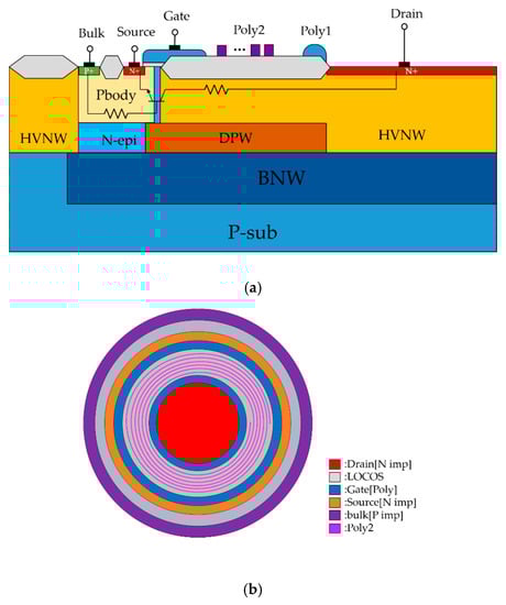 (a) Cross-sectional view and (b) layout top view of a circular lateral diffusion MOS (nLDMOS).