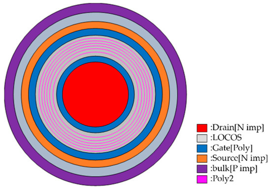 In this structure, the layout of the polysilicon-stripe varies from spiral type to concentric circle type, as shown in Figure 3. The spiral poly2 starts from the drain-side edge, then passes above the field-oxide layer in the drift region, and finally connects to the source electrode. Initially, when an ESD event occurs, the poly2 contact is damaged due to the excessive current density, which reduces the ESD capability. The concentric poly2 type has multiple concentric circles that float above the drift region. The concentric poly2 type reduces the peak value of the electric field below the FOX and increases the breakdown voltage. Additionally, the floating concentric circle poly2 has no contacts, so it avoids the risk of contact damage.