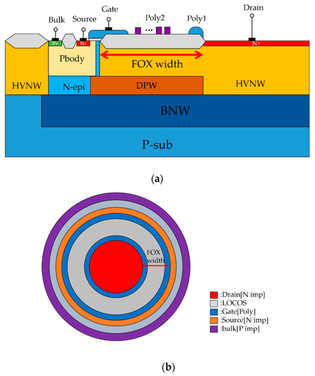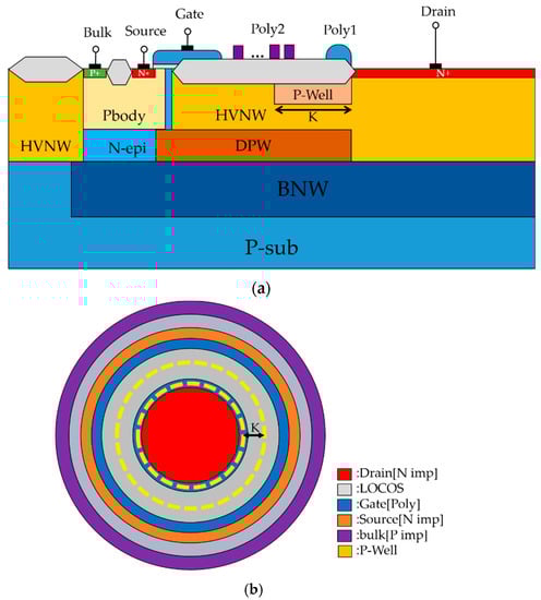 (a) Cross-sectional view and (b) layout top view of a circular nLDMOS with an embedded P-Well length modulation in the drift region.