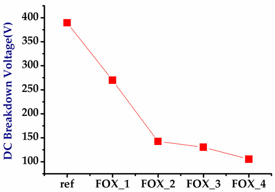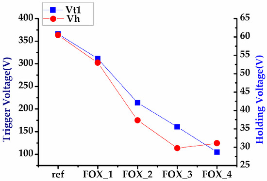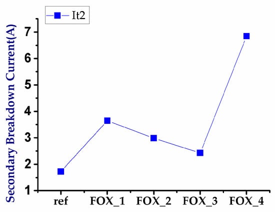 The experimental results of the UHV nLDMOS-related DUTs with the field-oxide width modulation in the drift region obtained from the breakdown voltage measurement and TLP testing are shown in Figure 7, Figure 8 and Figure 9. As the field-oxide width decreases, the the equivalent series resistance, the breakdown voltage, and the trigger voltage are significantly reduced, and the holding voltage also lowers. Interestingly, the secondary breakdown currents of the ESD capability were higher than that of the reference group. It appears that the higher the operation voltage is, the lower It2 value it has. The test results of the UHV nLDMOS with field-oxide width modulation in the drift region are shown in Table 5.