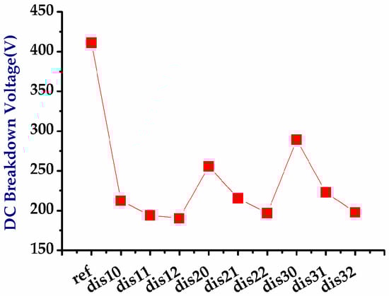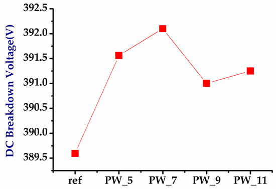 Similarly, the experimental results of the UHV nLDMOS-related DUTs with discrete HVNW layer modulation in the drift region obtained from using the breakdown voltage measurement and TLP testing are shown in Figure 10, Figure 11 and Figure 12. In Figure 10, the breakdown voltage decreases when the HVNW layer is discrete (or experiences an increase in unit cell spacing). Due to the continuous depletion region formed by HVNW/PBody/DPW in the reference device, it can withstand a breakdown voltage of more than 400 V. However, when the HVNW layer was discrete, the breakdown voltage decreased due to the discontinuous depletion layer, which cause the maximum electric breakdown decreased. Figure 11 and Figure 12 demonstrate that since the concentration of the n-epi layer is lower than the HVNW layer, the holding voltages of these HVNW discrete devices are higher than the reference group voltages, because the concentration is inversely proportional to resistivity, which means that the equivalent resistance of the n-epi is indeed higher than that of the HVNW layer. The test results of the UHV nLDMOS with discrete HVNW layer modulation in the drift region are shown in Table 6.