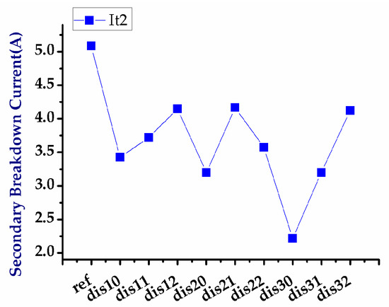 The experimental results of the UHV nLDMOS-related DUTs with polysilicon-stripe modulation above the drift region obtained from the breakdown voltage measurement and TLP testing are shown in Table 4. These experiment results demonstrate that the floating poly2 improves the electric field distribution under the field-oxide layer, smoothing the electric field distribution and reducing the peak value of the electric field to enhance the breakdown voltage of a device. The secondary breakdown current is strongly related to the breakdown voltage that a device can withstand. Therefore, in the same device geometries, we find that as the breakdown voltage increases, the secondary breakdown current also increases.