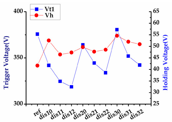 Trigger voltage and holding voltage trend charts of nLDMOSs with the discrete HVNW layer modulation in the drift region.