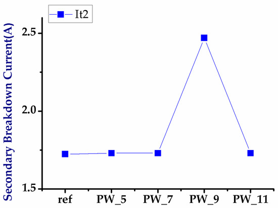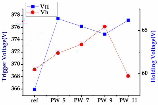 Finally, the experimental results of the UHV nLDMOS-related DUTs with embedded P-Well length modulation in the drift region obtained from the breakdown voltage measurement and TLP testing are shown in Figure 13, Figure 14 and Figure 15. The trigger voltage and the holding voltage increase when the current flow path is blocked by the P-Well, due to the N+/P-Well reverse bias junction, which results in an increase in the turn-on resistance. Nevertheless, even when the trigger voltage slightly decreases, the holding voltage increases related to the increase in P-Well length. When the P-Well length is 9 μm, the trigger voltage is the lowest and the holding voltage (65.5 V) is the highest. Meanwhile, its secondary breakdown current can be reached at 2.47 A, which is the best among the modulation samples. The test results of the modulations of UHV nLDMOS with embedded P-Well in the drift region are shown in Table 7.