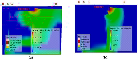 To verify the differences, the impact generation rate profiles of the UHV nLDMOS transistors with (a) a reference device and (b) an embedded 9 μm P-Well in the drift region structures under the VG = VS= VBulk = 0 V and VD = 310 V conditions are shown in Figure 16a,b. According to these three-dimensional (3-D) TCAD simulations, the general impact ionization process is described by Equation (1) [33]. Here, G represents the generation rate of the electron-hole pairs, and a device will fail if the G value is too high as in the reference DUT in Figure 16a The ionization coefficients for electrons and holes are αn,p, and these coefficients describe the number of electron-hole pairs generated per unit distance traveled by a solitary carrier between two collisions. Their current densities are represented by Jn,p. The impact generation rate profile of the reference device is higher than that of the embedded P-Well modulation. The minority carriers contribute to the drain current, and the majority of carriers are attracted and collected by the bulk electrode, thereby generating the bulk current. As the bulk current continues to increase, the additional carriers increase the forward currents in the transistors. Increasing the currents leads to massive growth heat generation that can lead to a device failure. Therefore, for ESD, latch-up immunities, and breakdown voltage performance, the embedded 9 μm P-Well in the drift region is the most suitable structure for drain-end modulated engineering.