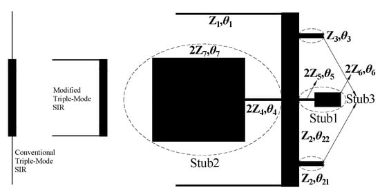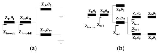 Since the proposed resonator structure is symmetrical with the horizontal X-axis, we use odd and even analytical methods to analyze it theoretically. Even and odd mode analysis is highly effective for analyzing multi-mode resonators. Through the theoretical calculation of the input impedance of the equivalent circuits in the odd and even modes, we can clearly deduce the influence of the resonator parameters on the modes within the passband. Figure 1 shows the construction process of the proposed simple compact quintuple-mode resonator. It can be seen that it is made up of a folded triple-mode resonator and three sets of open stubs. Figure 2a,b shows the equivalent transmission line circuits of the odd and even modes.