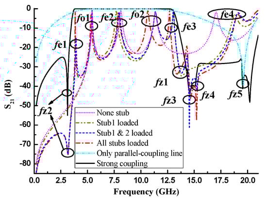 Figure 3 depicts the function of each part of the proposed quintuple-mode resonator. The results of adding open stubs are observed under the condition of weak coupling. In the middle position on the right side of the bent triple-mode resonator, we can also see that the stepped-impedance open Stub1 loaded horizontally can introduce an even-mode resonance fe3 and a TZ fz1 at high frequency, as well as pushing the higher-order even-mode fe4 generated by the triple-mode resonator to a higher frequency to improve the upper stopband performance. Due to the high-impedance-ratio Stub2, another new even-mode fe1 and TZ fz2 are produced at a low frequency, and two more TZs (fz3 and fz4) are created next to fz1. It is noteworthy that the S21 curve on the right side of fz1 is pulled down because of the TZs fz3 and fz4 close to fz1, which leads to the formation of a peak. From the previous analysis of even and odd modes, we know that Stub1 and Stub2 only affect the frequencies of even modes, and have no effect on the frequencies of odd modes. Therefore, whether the five modes in the passband are even or odd mode can be obviously identified, and this annotation is marked in the figure. Although all even and odd modes will be affected when Stub3 is loaded, the odd-mode fo2 and even-mode fe3 will shift dramatically compared to the others. These two modes move to low frequencies with different degrees, which makes the distribution of the five modes in the passband more reasonable. The S21 response of the proposed quintuple-mode resonator under strong coupling condition is also plotted in Figure 3 by the black solid line. In fact, the passband is eventually formed by three even modes, two odd modes and two TPs derived from the stepped-impedance parallel coupling line (to be explained in detail later) under strong coupling. Because of the strong coupling effect of parallel coupling line, the action of the TZ fz1 is offset (with the increase of the parallel coupling line length L3, the rejection level of fz1 is gradually weakened.). The remaining TZs fz2, fz3 and fz4 substantially enhance the selectivity on both sides of the passband. In addition, with the use of the parallel coupling line, the TZ fz5 is generated to notably ameliorate the suppression extent and width of the upper stopband.