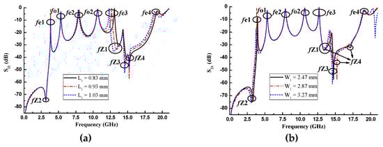 The proposed resonator has many dimension parameters, yet many of them have the same adjustment function. For example, the positions of fe3 and fz1 can be changed by tuning the impedance ratio or electrical length of Stub1. Figure 4a,b shows the adjustment of the low-impedance microstrip line length L1 of Stub1 and the low-impedance microstrip line width W1 (which can also be considered the impedance ratio) of Stub2, respectively. As L1 increases, fe3, fe4 and fz1 gradually shift to low frequencies with the other modes and TZs unchanged. The movement of fe4 is much smaller than that of fe3. The altering of size W1 in Stub1 causes the displacement of fe1, fz2, fz3 and fz4, and fz4 is the most affected. The change of their frequencies is inversely proportional to that of the W1 value. Tuning the length L2 of Stub3 can realize the control of odd modes, particularly fo2.