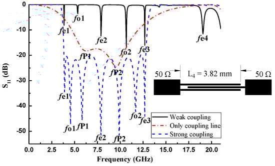 Figure 5 illustrates the reason why five TPs in the passband change to seven in cases of strong coupling. It can be observed from the response curves of the parallel coupling line and quintuple-mode resonator under weak coupling that the TPs fp1 and fp2 generated by the stepped-impedance parallel coupling line are between fo1 and fe2 and between fe2 and fo2, respectively. Because of these two newly added TPs, the reflection of this UWB filter can be further improved under the condition of equal bandwidth. The parallel coupling line with a narrow line width and slot width configuration is utilized to avoid double-sided etching instead of the frequently used aperture structure [8,11,13] and to feed energy into the resonator to realize strong coupling, which simplifies the processing steps and promotes circuit consistency. Moreover, if the circuit is etched on the back of the double-sided YBCO/MgO/YBCO high-temperature superconducting (HTS) films then the grounding treatment between the filter and the metal shielding box will be difficult because the indium film between them will affect the aperture structure.