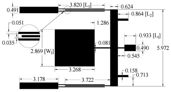 According to the above simulation analysis and the previously determined initial dimensions (especially the critical parameters W1, L1, L2 and L3), the simulation design and optimization are carried out by the full-wave electromagnetic simulation software IE3D. The substrate is MgO with a thickness of 0.5 mm and a dielectric constant of 9.8. The final circuit is presented in Figure 6, and all the size parameters have been marked in the figure (unit: millimeters).
