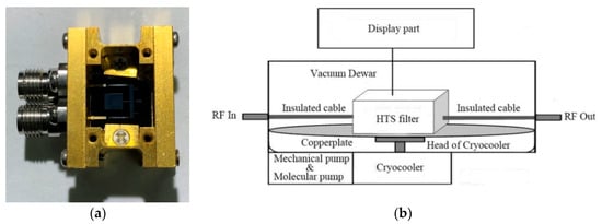 Measurement of the fabricated UWB filter: (a) the fabricated high-temperature superconducting (HTS) filter, and (b) the low-temperature test system architecture.