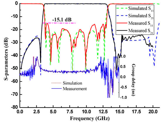 The HTS UWB filter was measured with a cover on, using a low-temperature test system, as shown in Figure 7b. The test procedures were as follows: firstly, the HTS filter on the copper plate was fixed in the dewar, and the insulation cables were connected to the filter connectors; the dewar was sealed, and the mechanical pump and molecular pump were used to pump it into a vacuum state. Subsequently, the cryocooler was turned on, cooling the filter to the superconducting conversion temperature of 70 K. The display module displayed the temperature of the filter in real time. Finally, the vector network analyzer was connected to the RF input and output of the test system. Figure 8 shows the measured and simulated response curves and illustrates that they were in good agreement. The 3-dB passband covered the range of 3.6–13.2 GHz, and the fractional bandwidth (FBW) was 114.3%. The in-band return loss was better than 15.1 dB, and the roll-off rate was up to 56 dB/GHz due to the introduction of TZs at the band edge. The upper stopband with a 20 dB suppression level was extended to 20.8 GHz. Most importantly, the maximum in-band insertion loss was only 0.32 dB. Further, the in-band group delay was about 0.3 ~ 1 ns. Table 1 compares this work with other reported filters. Obviously, the insertion loss, return loss and size of our filter demonstrate great advantages.
