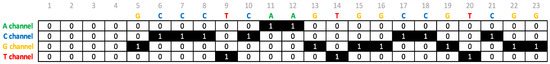 To make the sequences usable for the CNN, each sequence was encoded in a one-hot matrix with 23 columns, corresponding to the nucleobases of the sequence, and 4 rows, corresponding to A, C, G, and T bases channels. CRISPRLearner supports sequence up to a maximum of 23 nucleobases. For sequences with less than 23 nucleobases, a different approach has been adopted. Since an sgRNA gets encoded into a one-hot manner, if a sequence as a length less than 23, some columns of zeros have been added at the beginning of the real one-hot matrix. So, for example, a sequence of 19-bp will be encoded into a 4 × 19 one-hot matrix and 4 (23 minus length of sequence) columns of zeros have been added at the start of the matrix, creating a matrix of 4 × 23 and making the matrix usable for the CNN. All the dataset that we used for these experiments contains only sequences of 23-bp, so this problem should never appear, since the system is designed to work efficiently with 23-bp sequences. However, we have left the possibility to experiment on shorter sequences if the PAM sequence cannot be extracted, retrieved or is omitted or if a researcher wants to experiment using simply shorter sequences. Figure 1 shows an example of one-hot encoding of a sequence that has a length less than 23-bp.