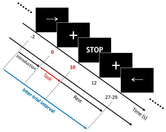 Experimental paradigm. A single trial comprised an introduction period (−2 to 0 s) and a task period (0 to 10 s), followed by an inter-trial break period (10 to 27–29 s). Among right-hand finger-tapping (RHT) (→), left-hand finger-tapping (LHT) (←), and foot-tapping (FT) (↓), a random task type was displayed during the introduction period, which the volunteers were required to perform.