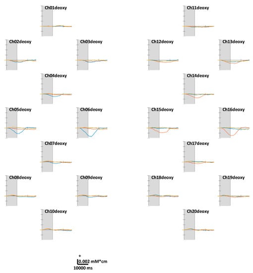 Figure 3 illustrates the task-related ΔHbO. According to the theoretical fact empirically established by numerous studies, the motor cortex regions in contralateral hemispheres were well-activated while the volunteers were performing unilateral finger-tapping. Distinct ΔHbR values were observed at Ch05, 06, 15, and 16 located in the anterior areas of C3 and C4. Unlike unilateral finger-tapping, while performing FT, the HbO responses were completely activated before (at 5–7 s) the end of the task period (at 10 s). At the end of the task period, the HbO level returns close to the baseline. We observed similar trends across all channels. For the ΔHbR values presented in Figure 4, as in the case of HbO, distinct ΔHbR in the direction opposite to that of ΔHbO were observed in (pre)motor cortices in contralateral hemispheres. Distinct ΔHbR was observed in the direction opposite to that of ΔHbO corresponding to the same location, particularly at Ch05, 06, 15, and 16.