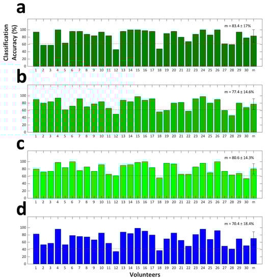 (a) RFT vs. LFT, (b) RFT vs. FT, and (c) LFT vs. FT binary classification accuracies. (d) Ternary classification accuracies. The error bars indicate the standard deviation. The X-label denoted by “m” indicates the grand average classification accuracy across the 30 volunteers. The grand average classification accuracy is provided in each figure. Red dashed lines indicate the theoretical chance levels (62.0% and 42.7% for (a–c) and (d), respectively).