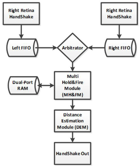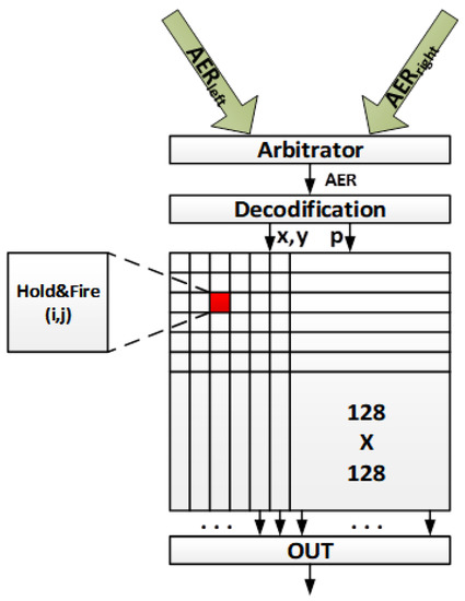 However, in this work, it is necessary to contemplate information concerning the retina (left or right), since, for the purpose of the spiking subtraction operation, it behaves in an opposite way whether it is a left retina spike or a right retina spike. This behavior was not necessary to be considered in the basic H&F operator, since it contemplated specific lines for each input. In our case, it is not possible to carry it out in that way due to insufficient hardware resources (128 × 128 × 2 inputs would be needed).