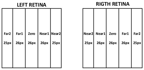 In order to verify the viability of this system and not cause an excessive segmentation of the projective space, it has been divided into five bands (neuron populations): Near2, Near1, Zero, Far1 and Far2. This segmentation is shown in Figure 6. Regarding the size of each band and based on the neuronal specialization of the human binocular system, an equitable division of the horizontal projective space has been used. Thus, Near2 and Far2 bands have a width of 25 pixels, while Near1, Zero and Far1 bands have a width of 26 pixels.