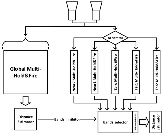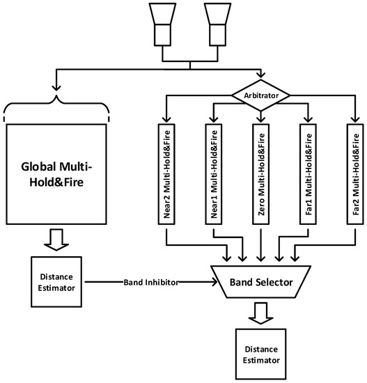 The global estimation system works as an arbiter to select the neural population where most spike traffic is focused. This system inhibits the outflow of the neuronal populations that do not intervene and allows the active population to send its outcome to the final distance estimator module. Once the active neuron population is selected, the final distance estimation module is carried out. So, the last distance estimation module is focused only on the projective space of the active band, ensuring that the noise coming from the rest of the bands does not intervene. The general functionality of the system is shown in Figure 7.