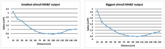 The results for the smaller and bigger objects are shown in Figure 8 left and right, respectively. The graphical representation is shown (to compare it with the human binocular system) and a table with the numerical values is presented to check the spikes rate for obtaining the threshold values (Table 2 for the smallest object and Table 3 for the biggest object). The tables show the integration of the spikes during the 10 s of sampling (second row), the equivalent spikes per second (third row) and the spikes at the output for 20 milliseconds. This last value is used for the threshold estimation, since the distance estimation module integrates the output spikes every 20 milliseconds in order to obtain approximately 50 outputs per second (without taking into account the initial delay of the components, which can be negligible once it starts working).