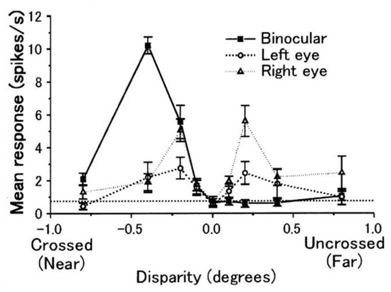 Binocular disparity detectors are cortical cells that trigger pulses with more frequency for those visual stimuli that have a specific binocular disparity. Binocular disparity detectors have been found in the cat’s cerebral cortex [12], and also in the monkey’s cerebral cortex [13]. According to the studies performed by Poggio et al. [14], the first stereoscopic information processes depend on three main functional systems of cortical neurons: