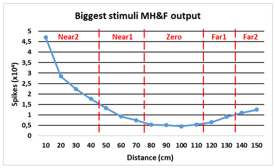 In both cases, the closer the object is to the vision system, the higher the output is. In the same way, the lowest event rate at the output of the Multi-Hold&Fire module is located in an environment close to the focus point (100 cm). These facts corroborate the theoretical study carried out initially and certify the feasibility of using this system to estimate distances of moving objects along the central convergence axis.