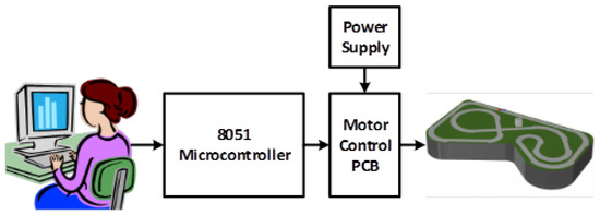 In order to keep the car in constant movement without using a user to manually control the vehicle controller, a new module based on a microcontroller and an engine control board is used. With this module and a developed user application, the vehicle speed can be quantitatively controlled, and it becomes constant over time. The block diagram of the additional system used is shown in Figure 12.