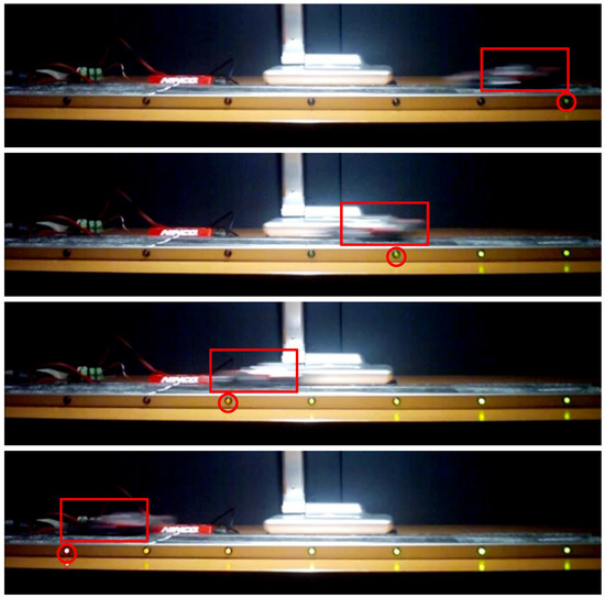 On the other hand, a LED array is added to the side, which will be used to validate the system functionality. The LEDs of this array are separated by exactly 10 cm and are positioned at the exact distances of the points used for the characterization tests. Due to the size of the Scalextric and its arrangement, it is not possible to cover all the distances used in the previous section, finally obtaining a range of 40–120 cm (considering all the neurons’ bands implemented in the system).