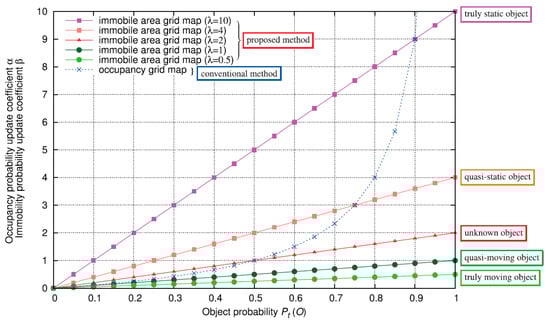 Simulation results of the relationships between object probability and updating coefficient []. Proposed immobility probability can be updated by different linear equations by adjusting .