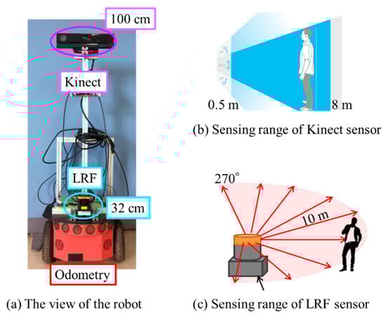 To realize our method, an autonomous mobile robot equipped with a laser sensor and a 3D RGB-D sensor was developed. The view of the robot is shown in Figure 3a. PIONEER 3-DX made by MobileRobots Co. was chosen as the mobile platform, which is programmable and easy to equip with sensors. LRF sensor was set at the height of 32 cm to scan the 2D distance information for generating the basic 2D map, and Kinect V2 sensor was set at the height of 100 cm from ground (just above the LRF sensor) for getting the RGB-D sensor in front of the robot. Here, Kinect V2 sensor made by Microsoft Co. was used to detect 3D RGB-D information around the robot, since it can sense the color and depth information at the same. It can sense maximum 8 m in front with the range of 70° in horizontal and 60° in vertical. The color information is good enough for object recognition, with the resolution of 1920 × 1080 pixels. It was equipped to the robot horizontally higher than the 2D sensor so that it can detect the obstacles and humans around within its sensing range, as shown in Figure 3b. UTM-30LX made by Hokuyo Co. was chosen as our LRF sensor due to its wide sensing range and high sensing accuracy. It can sense maximum 10 m in front with the range of 270°. The degree step is 0.25°. It was also equipped to the robot horizontally so that it can detect the obstacles and humans around within its sensing range, as shown in Figure 3c.