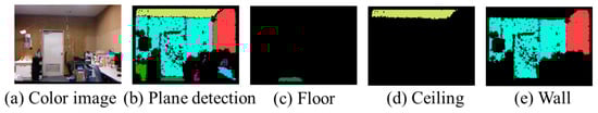 Both the LRF sensor and Kinect sensor are set horizontal against the floor, and they are also set on the same place in the vertical direction so that the projected information from Kinect sensor is overlapped with that from LRF sensor. The planes in the 3D space are detected by using point cloud library (PCL) []. For the scene shown in Figure 5a, the planes can be detected (Figure 5b). As the robot is working in the indoor environment, we segment the highest horizontal plane with the threshold higher than 2 m as the ceiling plane (Figure 5d). The vertical planes connected to the ceiling plane are recognized as the walls (Figure 5e). The horizontal plane in the height of the robot wheel is recognized as the floor (Figure 5c). The surfaces of other objects like desks can be also recognized as planes. As shown in Figure 6a, the desk is detected as four points by LRF, since only the four legs of the desk are detected (Figure 6c). The surface of the desk is detected by the plane detection process, and they are shown as the blue area in Figure 6b, after projecting on the ground. Besides, the red dots show the wall information (the points that are recognized as a wall in 3D information gotten by Kinect). The blue dots show the plane information of other objects (the points that are recognized as planes in 3D information gotten by Kinect). The black dots show the areas that are occupied by objects in the map and white dots show the areas that are not occupied. The gray dots show the areas that are still unknown. The cyan dots show the laser information gotten from the LRF sensor. The angles of these two sensors were adjusted to horizontal against the ground before the experiments. To solve the problem of vibration, the 3D information used for projection was corrected by using the estimated angle of the ceiling planes. As for the LRF sensor, it was set at the height of 32 cm over the ground and was used to get 2D information to generate the basic map. The sensor was fixed to the robot base at a low height so that the vibration was small. Meanwhile, the vibration for a few frames did not influence the mapping result, since the sensing results were updated online every once in a while, and calculated as probability.