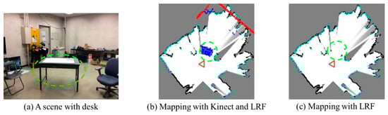 The accuracy of the generated 2D map by the proposed method has also been improved greatly. In the proposed method, the immobile area grid map is used for expressing the environment, and object recognition results are used for adjusting the coefficient to update the map. In this way, the recognized moving and potential moving objects (e.g., moving or static human beings) will be deleted from the map, since this information will not be used for updating the map from the beginning. Meanwhile, the changes of the environment (e.g., the door is opened during the mapping process) will be reflected to the map quickly compared with conventional mapping methods based on occupancy grid maps [,,,,]. The generated 2D map can be applied for controlling the robot in the same ways as before. Meanwhile, it can improve the accuracy of path planning and the safety when controlling the mobile robots.
