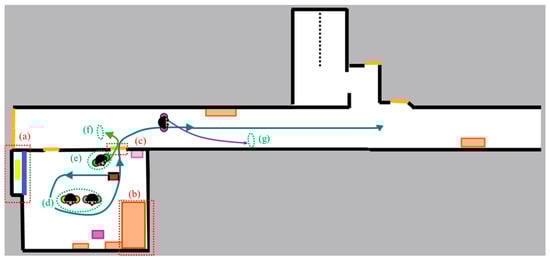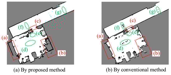 From the results, it is observed that all the humans were well detected and deleted from the map in the proposed method ((d–g), circled by the green line in Figure 9a), whether they were static or moving. On the other hand, in the conventional method, the humans who were static during the experiment were not able to be deleted in the map ((d), circled by the green line in Figure 9b). As for the moving people, some were deleted from the map slower than the proposed map ((e), circled by the green line in Figure 9b) and some appeared in the map ((f,g), circled by the green line in Figure 9b). The differences were caused by the updating method when generating the map. Since the humans were recognized by the proposed method, the immobility probabilities of the human areas were updated slowly by adjusting the updating coefficient as 0.5. As for the occupancy probabilities in the conventional method, they were updated fast, since the static human areas were also kept observed as objects so that they ((d), circled by the green line in Figure 9b) were left in the map. The person near the door ((e), circled by the green line in Figure 9b) was shown in the map for the same reason. Even when this person started to move, it took time to update the occupancy probability so that it was not completed deleted. Only the persons who kept moving were deleted for the conventional method (no human moving trajectories in the map). Besides, the persons may appear in the map easily if they stop, since they will be observed as static objects continuously ((f,g), circled by the green line in Figure 9b). The results prove the effectiveness of our method, which can delete moving and potential moving objects in real time when generating a 2D map.