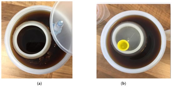 Different recipes for each layer of the phantom were tested to select those showing dielectric properties similar to those given in the upper half of Table 1. In this context, dedicated liquids were purchased from the ZMT Zurich MedTech Company []. As shown in the lower half of Table 1, the TLe11.5C.045 oil displayed (at 2 GHz) a dielectric permittivity of 7 and a conductivity of 0.3 S/m; the Tle5C24 displayed (at 2 GHz) a dielectric permittivity of 5 and a conductivity of 0.2 S/m. Thus, TLe11.5C.045 was selected as a cortical bone tissue equivalent material and Tle5C24 as a bone marrow tissue equivalent material. In addition, a mixture of glycerol and water with a ratio of 40% and 60%, respectively, was chosen as the recipe mimicking the lesion (blood), giving (at 2 GHz) a permittivity value equal to 60 and conductivity of 2 S/m []. Figure 3a,b shows the fabricated multilayered bone fracture and bone marrow lesion, respectively.