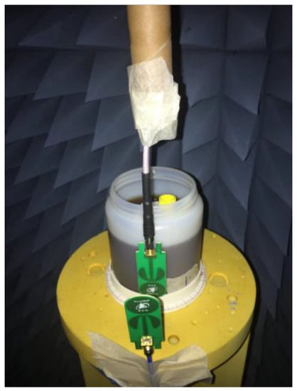 The positions of the phantoms with respect to the transmitting antenna are shown in Figure 5a,b, which represents the pictorial views of the measurement setup.