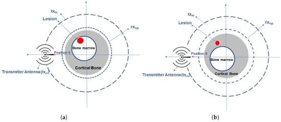 Bone fracture can be caused as a result of high force impact, a simple accident, stress or certain medical conditions that weaken the bones. The structure of the bones includes two principle parts: (i) cortical (compact) bone, which is a hard outer layer and is dense, strong, durable and surrounded by the cancellous tissue, and (ii) bone marrow, which is the inner layer, less dense and with a lighter content. There are many types of bone fractures []. Depending on the fracture severity, the injuries can lead to a reduction in the mobility of the patient []. X-rays, computed tomography (CT) and magnetic resonance imaging (MRI) are used as essential tools in the diagnosis and monitoring of bone conditions, including fractures, and joint abnormalities []. However, each technique suffers from its own negative aspects. For instance, fractures can be commonly detected by X-rays [], which is the fastest and easiest way to assess bone injuries, including fractures. However, since this technique involves radiation and can potentially cause damage, it raises major concerns especially in the cases of infants and stages of pregnancy. In addition, X-rays provide limited information about muscles, tendons or joints []. Nevertheless, CT is very effective for imaging and gives better quality images for body organs, such as an image of complicated fractures, subtle fractures or dislocations. However, similar to X-rays, ionizing radiation is the major problem of using this technique, which leads to limits in its application []. There is no ionizing radiation in the MRI technique, and it may be more useful in identifying bone and joint injuries. MRI can also detect occult fractures or bone bruises that are not visible on X-ray images, but the high cost of purchasing and maintaining such systems and their long time duration cause financial restrictions. Moreover, none of these devices are portable and cannot be used at the accident site. Thus, a fast and portable imaging system could be particularly useful locally for rapid diagnosis of bone injuries. A wide range of research concentrates on the development of new medical imaging techniques to achieve a portable, low cost and safe imaging alternative. Among these, using microwave imaging techniques has attracted the attention of researchers due to its various benefits such as the use of non-ionizing signals, low cost, low complexity and its ability to penetrate through different mediums (air, skin, bones and tissues []). The dielectric properties of human tissues can be used as an effective and accurate indicator for diagnostic purposes []. The significant difference between the dielectric properties of tissues with lesion and healthy tissues of the human body at microwave frequencies is the basis of microwave medical imaging techniques. Microwave tomography techniques, which give the maps of dielectric properties [,,], and the UWB radar techniques, which aim to find and locate the significant scatterers [,,,], are recognized as the two main branches of microwave imaging techniques []. Nevertheless, microwave tomography has its drawbacks such as low signal-to-clutter and complex mathematical formulation. Both microwave tomography and UWB radar techniques have been increasingly well investigated for stroke detection [], breast cancer detection [], bone imaging [,], and skin cancer detection [] through using different approaches at different frequency ranges.
