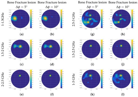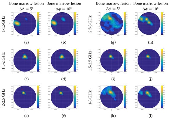 A further confirmation of such a finding may be drawn through a visual inspection of Figure 6i,j and Figure 7i,j and Figure 6k,l and Figure 7k,l, which show the images employing the bandwidth of 1 and 2 GHz for both the bone marrow lesion and bone fracture, respectively.