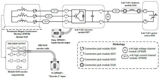The experimental system is shown in Figure 2, and the hardware connection is depicted in Figure 3. It includes a PMSM drive; speed encoder; power supply; insulated-gate bipolar transistor (IGBT) inverter; inductor line; dynamometer connected to the rotor shaft acting as a load; and data acquisition board (OP8660) with inputs for current, voltage and speed measurements and outputs for inverter pulses. The system is driven by the Opal-RT real-time simulator (OP5600). The schematic of the hardware connections between all modules is shown in Figure 4. The proposed cascade second-order SMC scheme is implemented in the Simulink/MATLAB and RT-LAB real-time simulation software environment, executed in the OP5600 and deployed to the system drive through the OP5600. The hardware in the loop (HIL) system, that includes the PMSM drive, the OP8660 and the OP5600, is illustrated in Figure 4. Details about the communication and deployment are available in [].