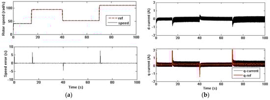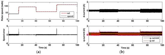 The robustness of the proposed control scheme against parametric uncertainties was verified in this experiment. The uncertainties include the mechanical parameters (moment of inertia and viscous coefficient) and the electrical parameters (magnetic-flux, resistance and inductance). The parameters were set in the control laws with different values than the real ones of the machine. Random and extreme variation were chosen, where the values of the mechanical parameters were increased by 50% in the controller and the values of the electrical parameters’ variations were changed separately ( increased by 20%, R decreased by 20% and Ld,q increased by 40%). Practically, the two important parameters to be tested are the resistance, which changes during the motor’s operation due to the heat, and the rotor inertia, which varies when coupled with an unknown load. In this work, variations of different parameters were tested in order to prove the control strategy effectiveness. Figure 7a shows the speed response under parametric variations, where a good speed tracking performance is reached with a zero steady-state error. Figure 7b represents the q-current command to ensure robustness against parametric variations.