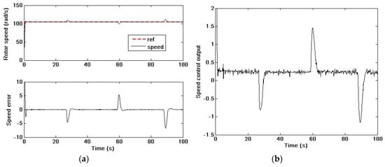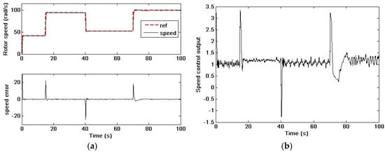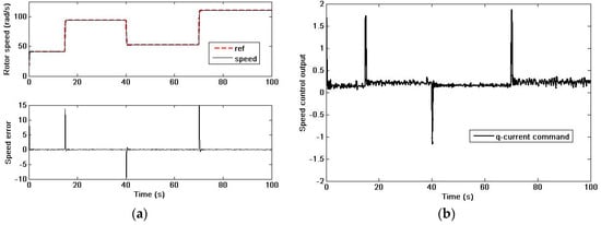 Finally, to verify the effects of an unknown load, the parameters of a dynamometer, coupled with the motor through a belt with a gear ratio 1:2, were not included in the controller design. Figure 10a,b represent the speed tracking response and speed controller output, where it can be observed that the speed tracking performance is successfully achieved even with the unknown perturbation.