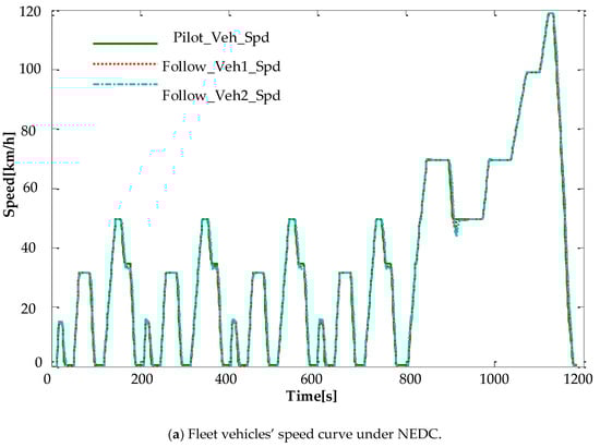 After building the model for the whole system, the simulation parameters were chosen. At the initial point t = 0, the headway between the vehicles was 15 m, and the lead vehicle started and followed the speed described by the NEDC drive cycle. The simulation time, traveling distance, and initial SoC were 1185 s, 10.9 km, and 0.7, respectively.