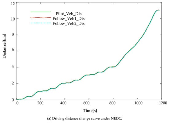 The relationships between the driving speed and distance of the vehicle and time are shown in Figure 9 and Figure 10, respectively. The solid line is the changing trend for the pilot vehicle speed and distance. The dotted line is the changing trend of the speed and distance for Following Vehicle No. 1, and the dashed-dotted line is the changing trend of speed and distance for Following Vehicle No. 2. To observe the distance relationship between vehicles, Figure 10b shows the changing curve of the distance between the pilot vehicle and Following Vehicle No. 1 under the NEDC drive cycle.