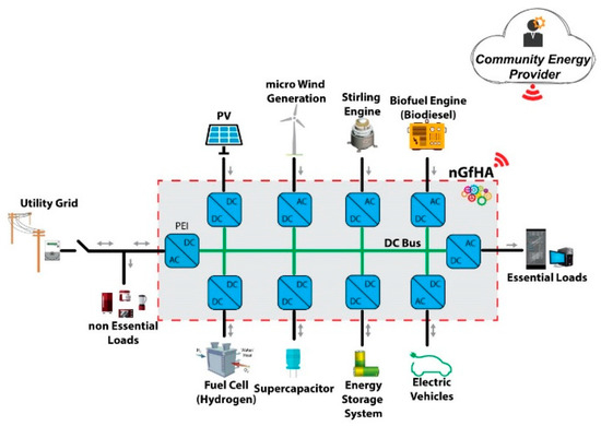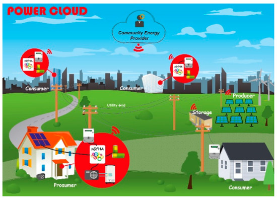 In order to implement the Power Cloud management model, it is essential to design and develop innovative physical systems, based on power electronics, IoT and ICT in general, for the generation, distribution and use of energy [21,22]. An example of enabling technology is the nanoGrid for Home Application (nGfHA), which allows the final user to take an active role. The nGfHA is a direct current (DC) nano-grid (generally not over 5 kW), which links generation plants—PV systems, micro-CHP (combined heat and power) with Stirling engine or natural gas micro-turbines, fuel cells, etc.—ESSs and loads (see Figure 2). The city users, who often live in residential multi-floor buildings, are generally consumers. These users can, with a small effort, host an ESS in the building and/or install a building automation system, but they cannot install a PV system on the building rooftop. A prosumer is a user equipped with an nGfHA, who can integrate an ESS (in this case becoming a prosumage) and one or more generation plants such as PV systems, micro-wind, micro-CHP, etc., which are able to produce surplus energy that can be offered to the consumers that participate in the same Power Cloud. The users who live in a rural area and own generation plants are examples of prosumers.