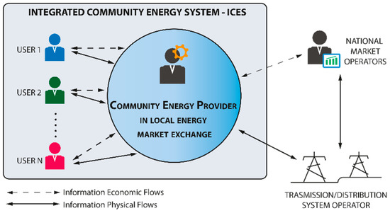 The ICESs represent locally and collectively organized energy systems and combine the concepts of sustainable energy communities, community energy systems, micro-grid communities and peer-to-peer energy systems. ICESs are able to integrate energy systems effectively, through the local generation of heat and electricity, the exploitation of flexible demand, the development of demand side management and the integration of smart-grid technologies, which together ensure a significant increase in the reliability and efficiency of local energy systems. The implementation of all these aspects is not easy. On the one hand, a massive use of ICT is required in order to monitor the physical state of the entire electrical system, collect and exchange data among the various stakeholders, and check and manage any abnormal situation: the new term Internet of Energy (IoE) arises in this context. IoE allows energy production to be performed more efficiently and cleanly with the least amount of waste. This term is derived from the increasingly prominent market for Internet of Things technology, which has helped to develop the distributed energy systems that enable the IoE [11]. On the other hand, the energy system must be designed to enable the active participation of all the players who act into the energy sector, ranging from system operators, market operators, large and small producers to the consumers themselves. Though some experiences on the preliminary implementation of ICESs are appearing [12,13,14,15], a unique model does not exist. An overview of different types of energy communities in Europe, and an appropriate and detailed classification, are presented in [16]. In particular [16], presents clear and fact-based insights, using a systematic and analysis-driven approach, to deliver undisputed recommendations for the enabling framework of energy communities in Europe.