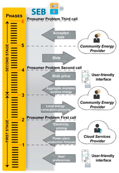 The CSP executes an appropriate set of algorithms, and delivers data (e.g., the energy production forecasts and the TOU tariff) to the SEB, which then solves the prosumer problem for the first stage. The daily workflow of the SEB, implementing the energy market, that is, the LEM (local electricity market) day ahead auction, is outlined in Figure 5 [28].